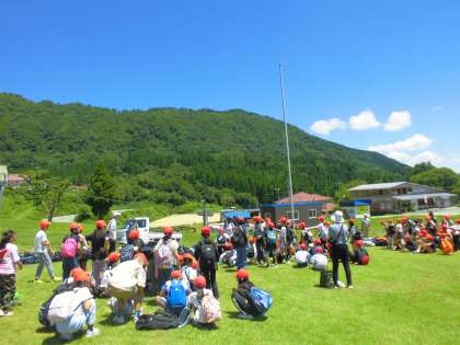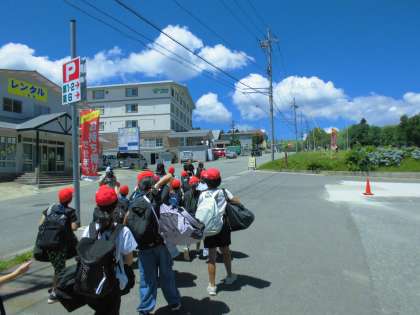 「あ!あの建物かな」「やった!着いたで〜」いよいよ宿舎に到着です。ボストンバックをグリーン広場に運び入れました。