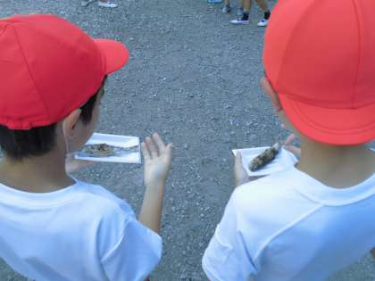 一緒になかよく捕まえた2人は、「一緒に、いっせいの〜で、で食べよっか」「わっ、手にいっぱい塩付いた」と隣同士で仲よさそうに食べていました。