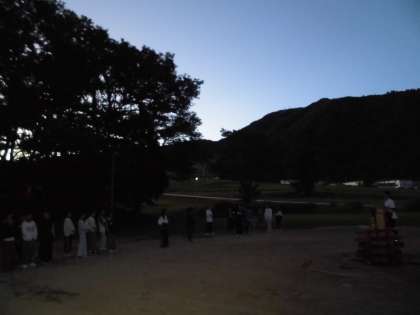 キャンプファイヤー場は、宿舎のすぐそばにあります。そこへ、キャンプファイヤー係の子どもたちが、少しだけ早めに集まって、最後のリハーサルを行っていました。声もよく出ています。「みんなが楽しんでくれたら」「みんなで楽しい時間が過ごせるように」と、がんばってきたメンバーです。宿舎の方も早くから薪を重ねて準備し、見守ってくださっていました。間もなく、キャンプファイヤーの幕開けです。