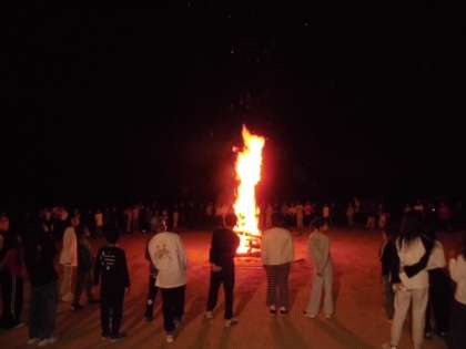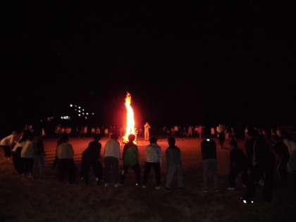 キャンプファイヤー係さんたちの楽しい寸劇とかけ声でファイヤーがスタートしました。火の神様の登場で薪に火が灯され、「燃えろよ燃えろ」の歌声がハチ高原に高らかに響き渡りました。