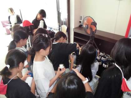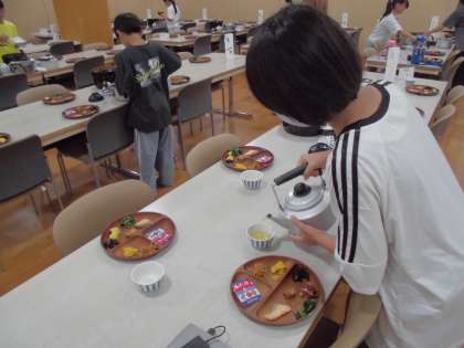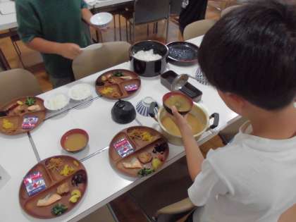 朝のつどいで先生から話があったように、水筒を忘れず食堂に持ってきた子どもたち。食事係の子どもたちも、昨日よりも手際よく、サクサクと準備を進めていました。さいごに、みんなが食べやすいようにと食器を並べ替えている様子も。すごいですね。