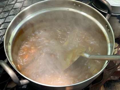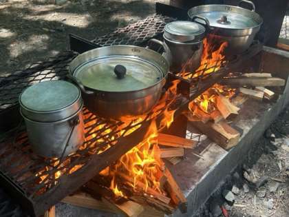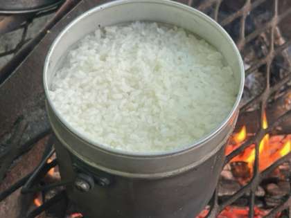 釜戸担当の子どもたちは、火をつけることに悪戦苦闘。それでもこれはいい経験です。やっと着いた火に「おぉ〜」と歓声があがりました。みんなで力を合わせて美味しそうに、完成!です。