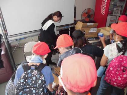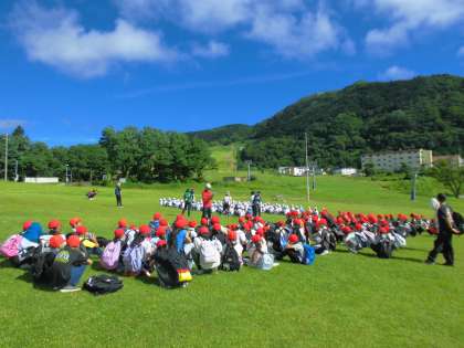 宿舎の方に冷たく凍らせてもらったスポーツドリンクを玄関で受け取り、活動班ごとに集合です。広場では、担任の先生が山登りについての諸注意を行い、いよいよ「がんばるぞ」の気持ち」も高まってきたようです。今日はとても暑い日だったので、子どもたちも大喜びでした。PTA保護者の方々の子どもたちへのご支援に深く感謝いたします。