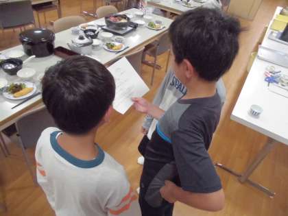 宿舎をバックに記念撮影、続いて入浴タイムのあと、今夜も食事係の子どもたちが早めに食堂に来て準備の手伝いをしていました。そんな中、今夕食のあいさつ当番になっている子たちは、ちょっとできた隙間のこの時間に、自分たちで小さめの声でリハーサルをしていました。たったこの2日間のことですが、こういった様子に、自主性も成長してきているなぁと感じた一場面でした。