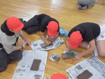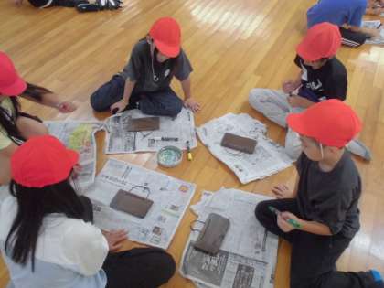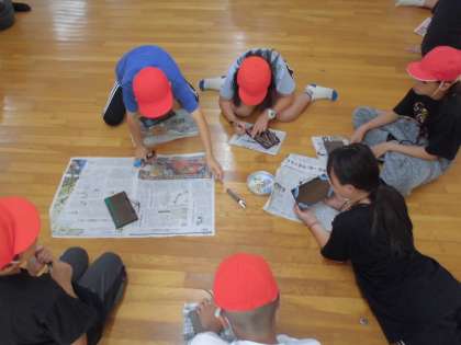 子どもたちは、活動班ごとに輪になって、思い思いに描き始めました。