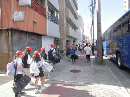 たくさんの保護者や家族の方々、先生たちに迎えられ、子どもたちは、うれしくもどこか照れくさそうな、ほっとした表情で荷物を体育館に運びました。玄関まで行くと、さらに多くのお家の方々が笑顔で待ってくださっていました。あたたかなお出迎え、ありがとうございました。