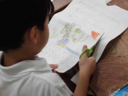 1年生の子どもたちが、「あさがおの観察カード」を丁度よいサイズに、はさみを使って切っていました。はさみも随分上手に使えるようになってきたねぇと見ていると、「あんな、実はまだぼくのあさがお、あんまり咲いてなくって、まだ毎日水あげてるねん」と教えてくれました。「早く咲いてほしいなぁ」と思いながら続けた水やり。つぼみができて、朝、咲いているのを見つけたときの楽しみが、これから待っていますよ。