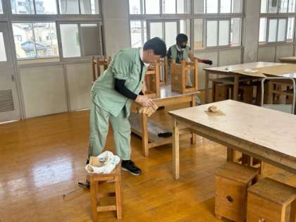 今日も暑い中、管理作業員さんがせっせと作業を進めてくださっていました。今回は図工室の机ね天板の貼り替え。実は夏休みのときから、元ある机の上を、汚れを取ったり、きれいにフラットになるよう少しずつ磨いてくださったりしていました。皆んなが使える日が楽しみですね。