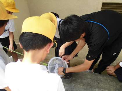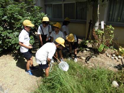 まだまだ暑い日が続く9月ですが、理科の時間に子どもたちはビオトープに行き、秋探しの活動をしました。「ちっちゃいバッタおった!」「コオロギもいたよ」。この暑さには虫たちもびっくりかもしれませんが、よ〜く見れば、いろんな発見がありそうですね。