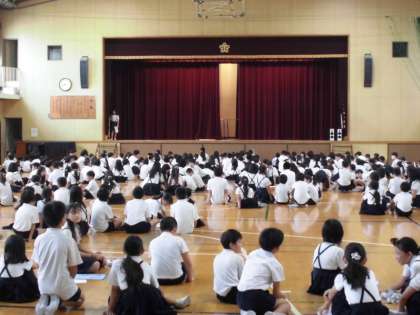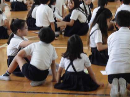 なかよし集会です。今回は、このカーテンの隙間を通る物を当てましょう!クイズでした。「何?何?今のん!?」「あ!わかったわかった」と、班でいっしょに相談して書き込んでいました。「全問正解したよ!」…異学年どうしの子どもたちが交流できるこの時間は、子どもたちにとっても、朝の楽しいひとときになっています。