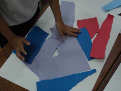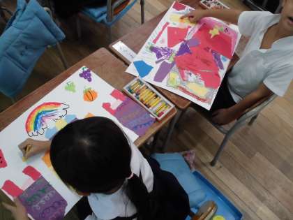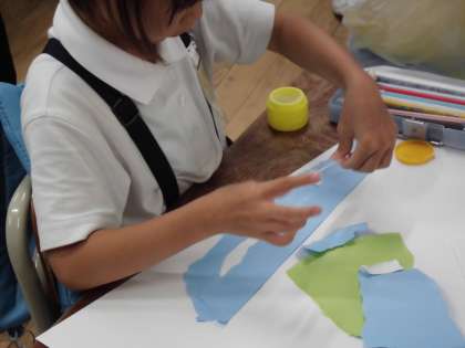 1年生の図画工作科の時間です。そっとやぶいてできたかたち。じっとみつめていると、どんなようすが浮かんでくるかな…。子どもたちは、いろいろな向きからかみを眺めたり、組み合わせたりして、いろいろ考えを巡らせていました。またでんぷんのりを使って、白い画用紙にはる場面では、中指を上手に使ってのりをすくいしっかり伸ばして、紙と紙とをぎゅっと押さえてつけていました。こうやって低学年で学んだこと、身に付けていくことは、これからの活動の広がりへとつながっていきます。