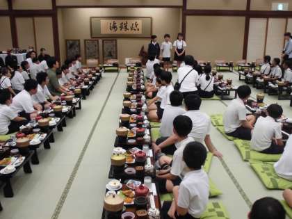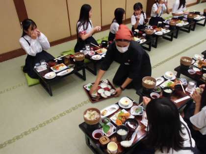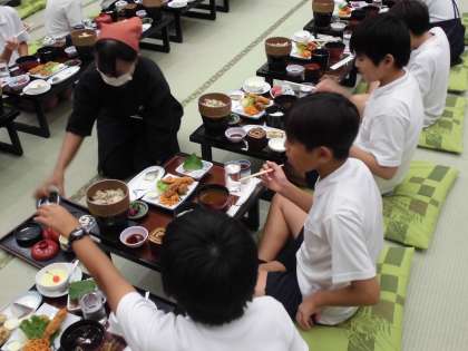夕食は品数も多く、ひとつひとつが美味しかったですね。あいさつ担当の児童は、メニューをちゃんと覚えていて、練習の成果がバッチリでていました。食事中は、お茶やごはんをおかわりするときに手を挙げ、スタッフの方々の優しいことばかけに子どもたちもうれしそうでした。