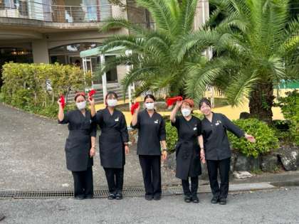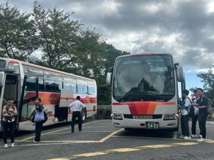 退館式を終え、バスに乗り込みました。お世話になった旅館の方々が、赤いハンカチ(←シーユーアゲイン、また会いましょうね、の意味です)を振って見送ってくださいました。これから約10分程で、鳥羽水族館に到着です。