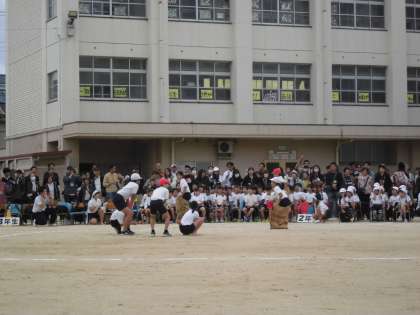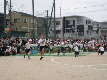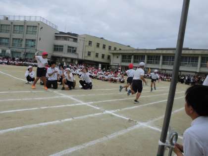 プログラム3番は、3年生による「とんでくぐって」です。スタートから勢いよくダッシュし、ぴょんぴょんとんだり、スルスルくぐったりしながらゴールをめざしました。