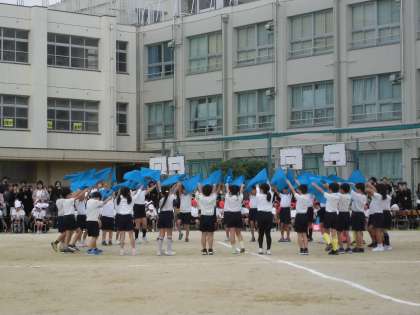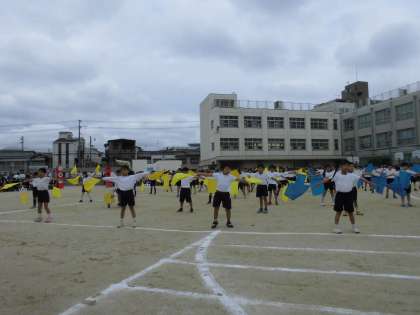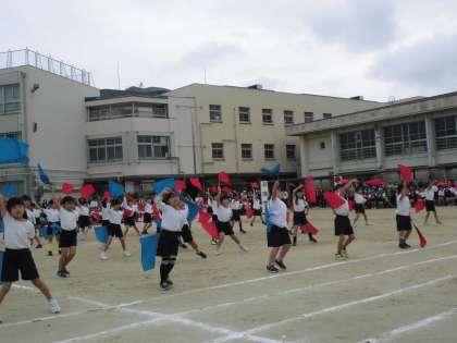 プログラム4番は、2年生による団体演技「友情の花〜2年生のキズナ〜」でした。心やさしくて元気いっぱいの2年生。クラス・学年で心を一つにして、フラッグを持って演技し、友情の花を咲かせました。