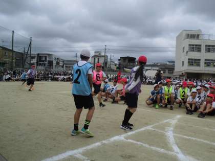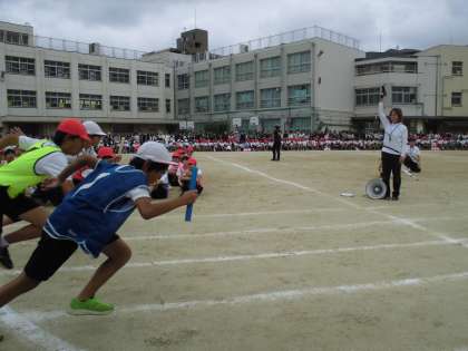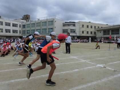 プログラム7番、6年生のリレーでした。6年生にとっては、今年は「小学校生活最後の…」がいろいろな行事の度に、枕詞のように付いてきました。いよいよリレーも「ファイナル」です。6年間一緒に過ごしてきた仲間と、心ひとつにバトンをつなぎ、最後まで全力でゴールをめざす姿に、会場全体から熱い声援が送られていました。