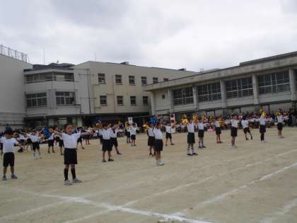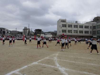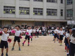 プログラム12番は、1年生の団体演技「みんなでゲッタバンバン!〜えがおをひろげよう〜」でした。運動会の練習が始まってからというもの、体育館でも、運動場でも、子どもたちの元気なかけ声を響かせていた子どもたち。最初はどきどきした表情もありましたが、曲に合わせて身体いっぱい使って楽しくおどる1年生の姿に、会場のみんなに笑顔が広がりました。