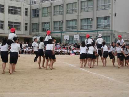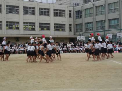 プログラム13番は、5年生の騎馬戦でした。最後の得点競技となるこのプログラム。騎馬を組んで悠然と入場してくる5年生に、低学年の子どもたちからは「おぉ〜」「すごい」の声があがり、会場全体も盛り上がりを見せていました。特に最後の大将戦では、はじめは大将を守る陣形を取ったり、途中からは左右から攻めに転じたりと作戦も練ってきたようです。ひとつひとつの勝負に、高学年ならではの迫力が感じられました。