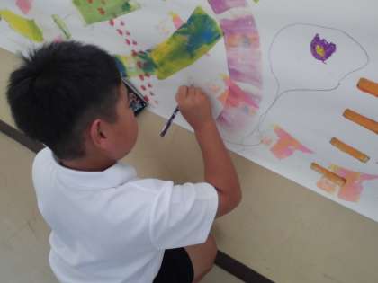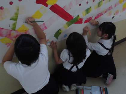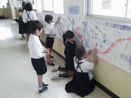 11月。子どもたちにとって、育和小学校がもっと楽しくて、居心地がいい学校になりますようにという願いを込めてスタートしたプロジェクト「楽プロ」の様子です。休み時間になると、子どもたちは色鉛筆やパスを脇に抱えて「えっさ、ほっさ」と集まってきてくれました。そして、思い思いに絵を描き加えていきました。