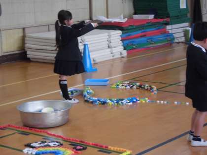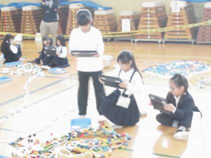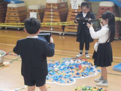 1年造形遊びの時間の最後に、子どもたちは自分のお気に入りの角度から、一人一台端末に写真をおさめていきます。同じ場所で活動をしていても、ペットボトルのキャップの形や色を生かしながら並べたり積んだりしながら、感じ取ったり考えたりしたことは、子ども一人一人によってちがいます。「けっこういい感じにできたなぁ」と、振り返っていました。
