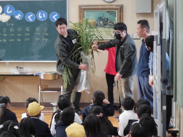 育ててきた「しょうが」を収穫しました。この日、朝早くから高知県を出発した農業に携わっておられる皆さん、東部市場の方々とは、久しぶりの再会。果たしてしょうがはどれくらい大きくなったのでしょうか。植えていた場所に移動し掘った時からそのでかさにびっくり!でしたが、植えるときに量った重さと比べると、その差は一目瞭然。「190g→1150g」「130g→1320g」、そして何と「100g→1400g」と、14倍もの重さに成長したものもありました。この日の質問コーナーでは、育和の子どもたちらしい、素朴で素直でユーモアのある質問にも、丁寧に答えてくださり、おいしいしょうがの食べ方のレシピも教えていただきました。本当にお世話になり、ありがとうございました。