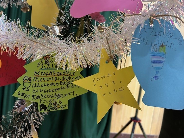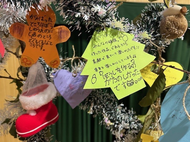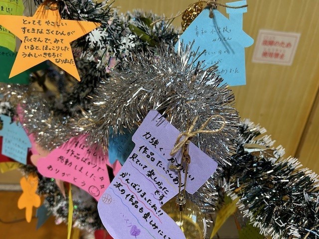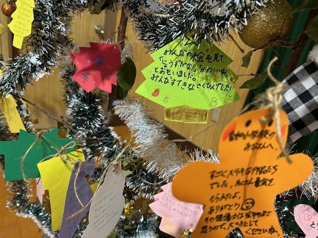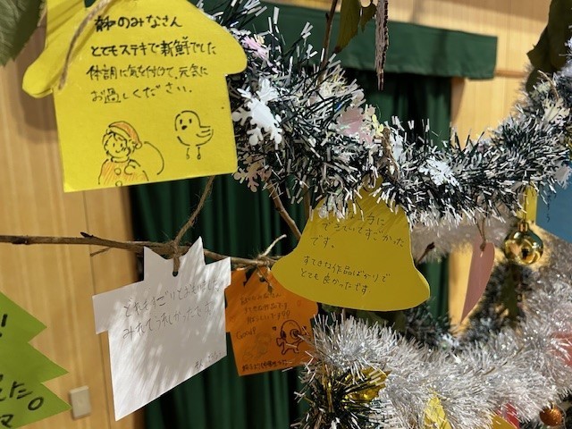 作品展の際にお寄せいただいたメッセージの数々。「育和のツリー」に飾っていただきました。今は玄関に展示しています。子どもたちも、休み時間や登校・下校時など、帰る時間が来ても玄関ピロティに残って1枚1枚見てはうれしそうにしていました。本当にありがとうございました。