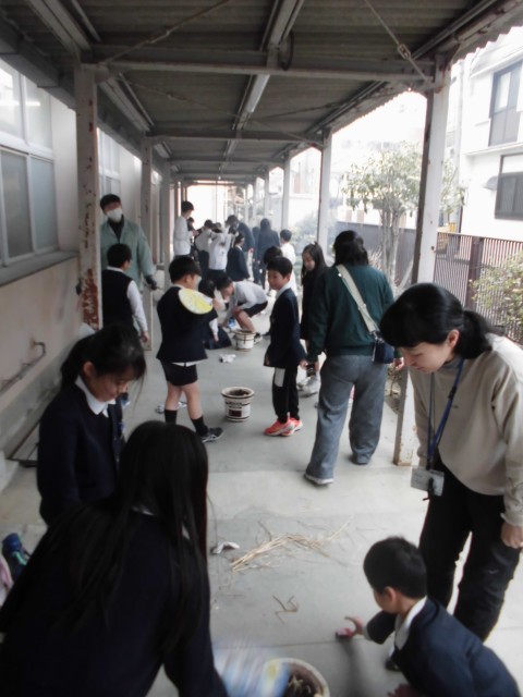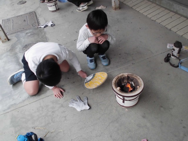 3年生が火起こし体験をしました。「なかなか火が付かないねぇ」「昔の人も、こうやって苦労してたのかな」。新聞紙を入れたり、うちわで空気を送ったりして、ようやく炭に火が付いたら、お待ちかねのお餅焼きタイムです。「お正月のときもお餅焼いて食べたけど、今日のは、抜群においしい!」と大満足の様子でした。