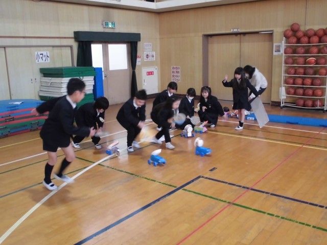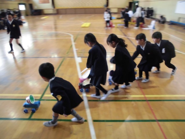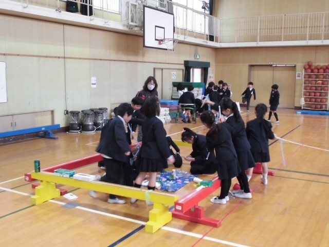 2年生が生活科の学習で準備を進めてきた「手づくりおもちゃらんど」に1年生を招待しました。この日のために「どうすれば1年生が楽しんでくれるかな?」と試行錯誤しながら、身近な材料で動くおもちゃや、遊びの説明ポスターや、コーナーの看板など一生懸命つくってきました。当日は、近くに行って「ここはこうやって遊ぶんだよ」と教えてあげたり、1年生が上手にできたときは「すごいすごーい!」と自然と拍手を送るなど、随所に、優しく教える頼もしい2年生の姿が見られました。1年生も、お姉さん・お兄さんがつくった工夫いっぱいのおもちゃに目を輝かせ、説明を聞くときは指定の場所にちゃんと座って静かに聞いて、夢中になって遊んでいました。体育館いっぱいに楽しそうな歓声が響き渡るすてきなひとときとなりました。
