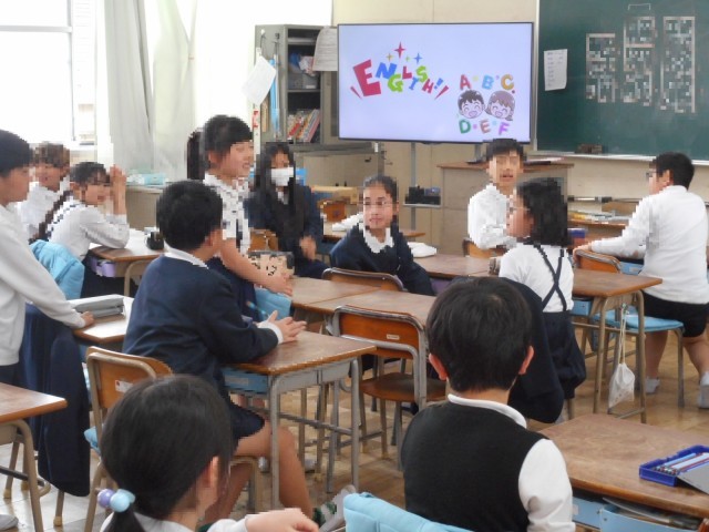 みんなに見つめられる中でのあいさつは少し照れくさいですが、どんどん英語で発語していくうちに慣れていきます。