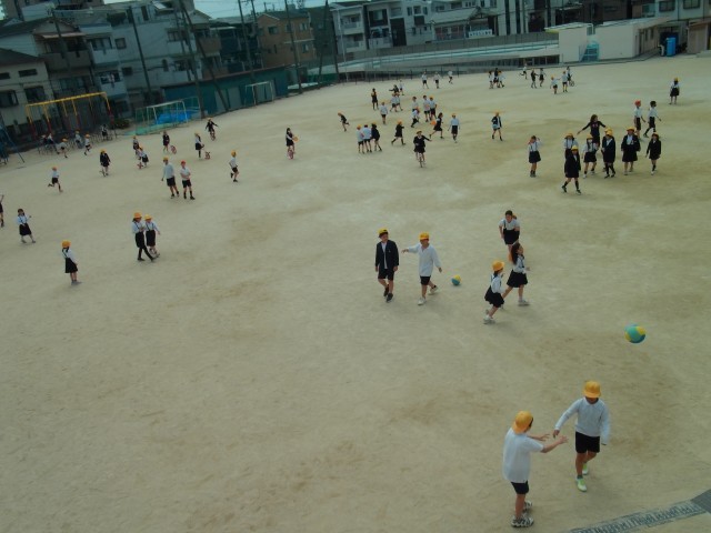 運動場で友だちと鬼ごっこやボール遊び、遊具で遊ぶ姿も見られます。