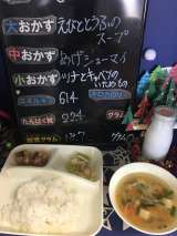 本日の給食は「ご飯、あげシューマイ、えびととうふのスープ、ツナとキャベツのいた...