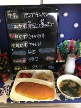 本日の給食は、「豚肉のケチャップソテー、コーンスープ、焼きプリン、レーズンパン...