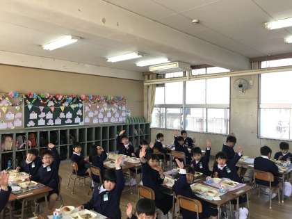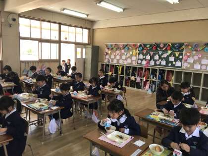 「おいしいですか?」と聞くと「はーい(^^)/」と元気よく答えていました。明日は、給食当番はエプロンに着替えます。そして、6年生と一緒に給食室にいったり、配膳したりします。