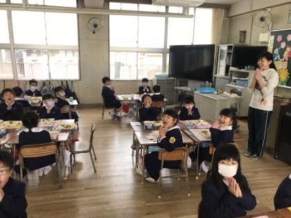 「いただきます」のご挨拶。「手を合わせてで、パチン!と音を鳴らすのは、だめですよ。静かに手を合わせましょう」と森田先生。静かに手を合わせる1年生たち。かわいらしいです。