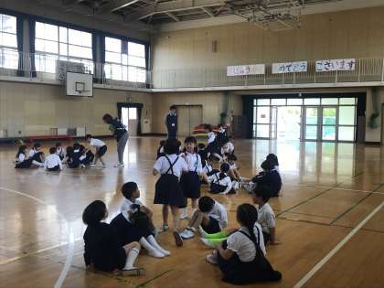 学校案内が終わった班から講堂に戻り、ほかの班が帰ってくるまで「ハンカチ落とし」をして遊びました。