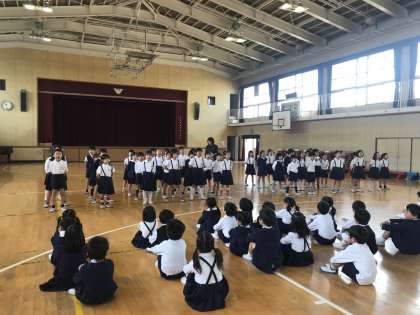 「とってもお利口な1年生と2年生ですね〜」「これだと、こんどの遠足も楽しくいけそうですね〜(^O^)」河野&森田はすぐに、ミニコントを始めるので、去年の森田学級の子どもからは「練習してるん?」と言われてたのですが、即興です(笑)