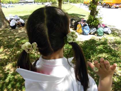 「あんたがたどこさ」や「おにごっこ」「リレー」などを楽しむ2年生。1年生は、クローバーを摘んで、髪飾りや指輪にして遊んでいました。花束にして、ブーケトスごっこもしていました。「先生、ひろって」と言われ、「もう結婚してるよ〜(;^_^A(笑)」「この花束、小川先生にあげよう」というかわいい声も聞こえてきていました。