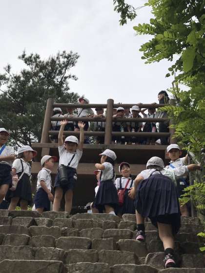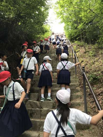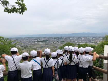 学年ごとに、順番に階段を上り詰めました。頂上からの景色は格別で、気持ちの良い風を頬に感じました。大阪平野の様子も学習することができました。
