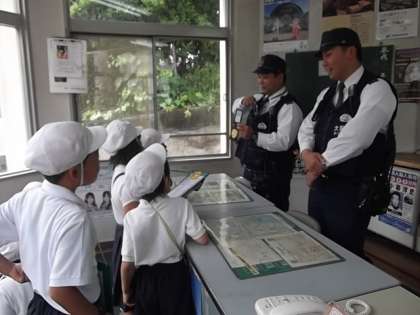 「鷹合交番」。おまわりさんが、警棒や手錠も見せてくださいました。悪い人をつかまえてくれる正義の味方です。町のヒーローですよね。