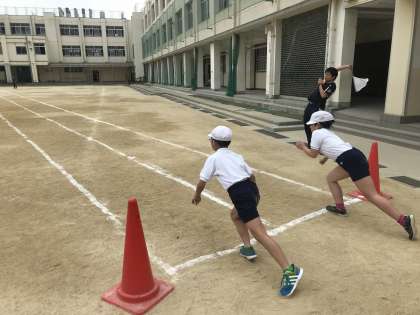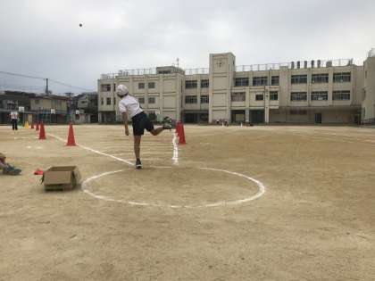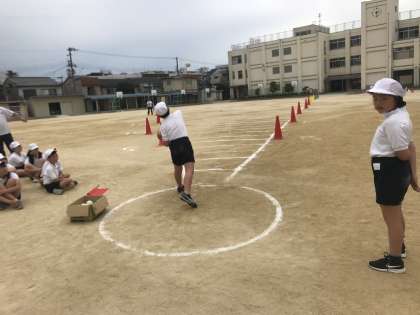 いよいよ最高学年の出番です。5年生から大原先生の記録をきいているので、「打倒・大原先生」でがんばったようです。昨年5年生の時のソフトボール投げの平均記録は「男子19.31m 女子11.69m」でした。