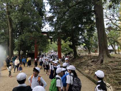 5、6年生の春の遠足は、奈良公園です。地下鉄、近鉄と乗り継ぎ、奈良公園に着きました。電車のマナーもよく、他の乗客から褒められました。