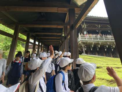 奈良公園では、鹿の暖かい出迎えを受け、キャーキャー言いながら、東大寺まで歩きました。6年生は今、歴史の学習をしているので、興味深く見ていました。