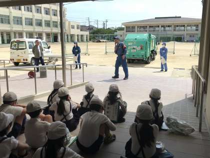 4年生の社会科の学習で「住みよいくらしとごみ」について学んでいます。今日は、中部環境事業センターの方に来ていただき、わたしたちが生活の中で出すごみを、どのように集めてどのように処理をしてくださっているか、また、仕事をする上での苦労についても教えていただきました。