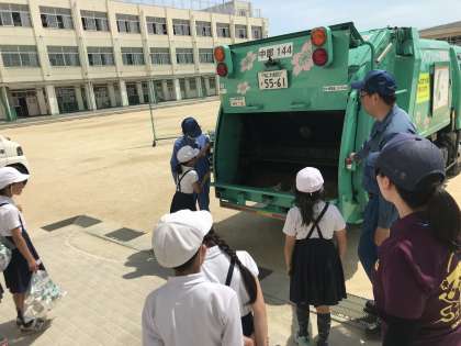 実際にパッカー車が、校庭に入りました。パッカー車には三つの種類があり、ディーゼルやハイブリッドなど環境にやさしい車となっているそうです。普通ゴミ、資源ゴミ、容器包装プラスチックの分別ゴミで、よびかける音楽も「小鳥が来る町」「赤トンボ」「草競馬」と分かれています。