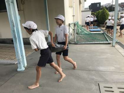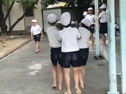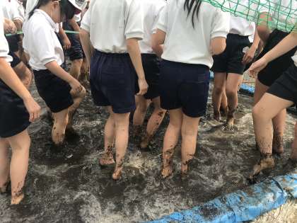 土と腐葉土を倉庫から運び出し、田んぼの中に入れ、よく練り合わせます。そして、平にします。練り合わせは人の足で。みんなドロドロになりましたが、最後はホースできれいに洗い流しました。暑い午後でしたので、気持ちよさげでした。非常に手際よく、63人が協力して、実施することができていました。