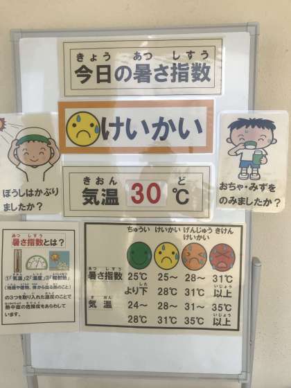 5月ですが、早くも、保健室前に「今日の暑さ指数」の案内板が設置されました。熱中症にならないよう、注意を促していきます。