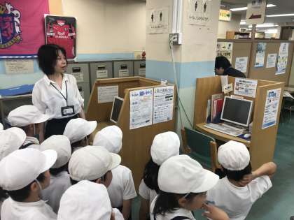 館内では、クラスごとに各コーナーを回りながら、スタッフの方が説明をしてくださいました。ところどころ「この本知ってる!」と子どもたちも話していました。