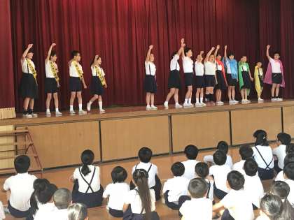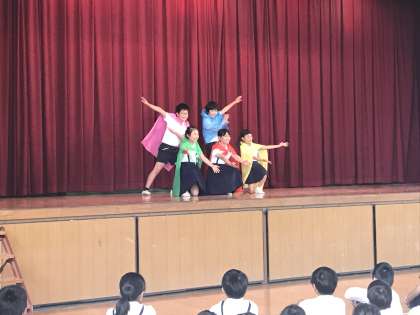 今日は、児童会代表委員が、「あいさつをしよう!」ということを劇にして発表してくれました。あいさつの重要さを教えてくれる「あいさつレンジャ—」が、あいさつビームを出してくれて、あいさつ嫌いだった子が大変身!という寸劇ですが、代表委員の芸達者なこと(^O^) ミニ大原先生でしたね。会場全体に笑いを取りながらも、あいさつの大切さを伝えてくれました。