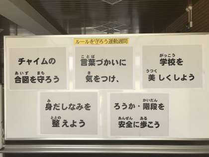 「ルールを守ろう運動週間」は、来週月曜スタートです。「チャイムの合図を守ろう」「言葉づかいに気をつけ、身だしなみを整えよう」「学校を美しくしよう」「ろうか・階段を安全に歩こう」これらのルールを重点目標として、昨年度から継続的に強調週間を設け、取り組んできています。