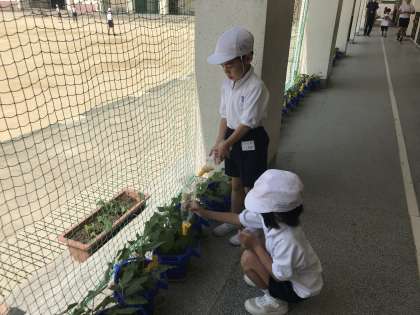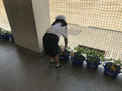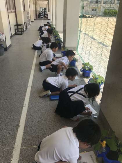 毎朝忘れないでお水をあげてきたので、アサガオがぐんぐん育ち、本葉の枚数も増え、ツルが伸びてきている鉢もあります。今日は、観察カードに記録した後に、世話がしやすい場所に移動し、支柱を立てました。